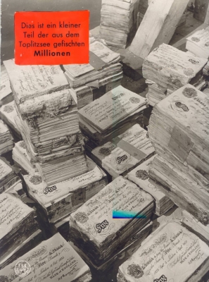 Im Jahr 1959 hatte Stern-Reporter Wolfgang Löhde im Toplitzsee aus 80 Metern Tiefe 17 Kisten voll gefälschter Pfundnoten und zwei Kisten mit Dokumenten geborgen, die im Rahmen der Aktion Bernhard hergestellt und in den letzten Kriegstagen von einem SS-Kommando hier versenkt worden waren. Regisseur Franz Antel beschloss, dies zu verfilmen und arbeitete während der Dreharbeiten eng mit Löhde zusammen. Da der Film wenig erfolgreich war, wagte sich Antel in der Folge an kein ähnliches Projekt mehr. – Wikipedia / Franz Antel: Verdreht, verliebt, mein Leben, München, Wien 2001, S. 130 ff.